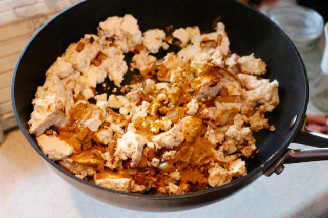 Crumble tofu into the pan with sauted fennel bulb, breaking it up with your fingers. Re-stir and pour liquid seasoning mix over tofu and mix well, trying to color as much tofu as possible. Cook for 2 minutes or until tofu is hot throughout.