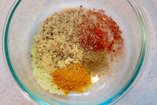 In a small bowl, mix together nutritional yeast, turmeric, cumin, paprika, fennel seed, water, tamari, salt, and pepper. Set aside.