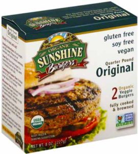 Sunshine Burgers don’t taste like meat but I firmly believe that vegetable products should NOT taste like meat. Foods should taste like what they are. They are soy free and gluten free, but do contain brown rice.